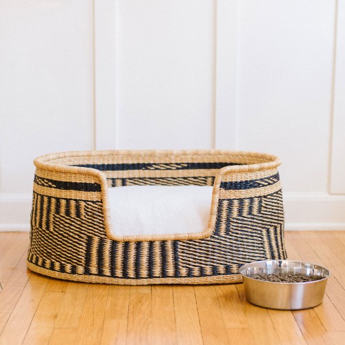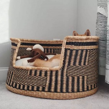 Kauai - Panier tressé pour chien / chat en herbe naturelle, motif abstrait noir